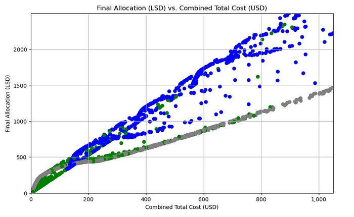低保用户分配的空投并不是很多,一般在50个LSD以下,但由于项目不PASS低保(收到少于 1 LSD 的地址将被删除),所以是多号用户的福音。低保用户如果只刷交易量,按照平均交易成本0.2%计算,刷500U交易量的成本在1U左右,我看群友最低可以拿10个SLD,值多少钱,下文会解析。