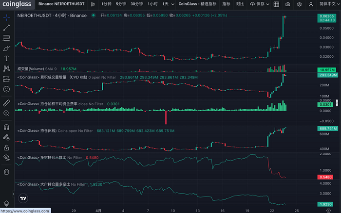 拆解细分指标来看,根据Coinglass数据显示,NEIROETH目前全网聚合多空比为1.05,