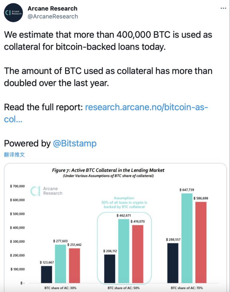 链捕手消息,Arcane Research发布报告称,估计目前有超过40万枚BTC被用作比特币担保贷款的抵押品。过去一年,当做抵押品的比特币数量增加了一倍多。