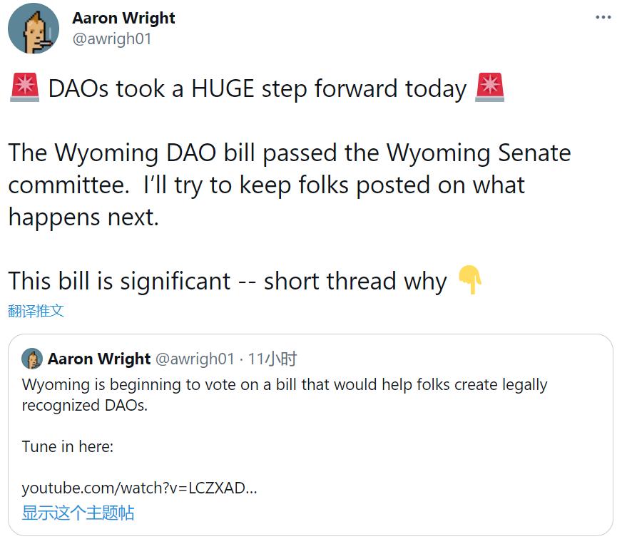 链捕手消息,据OpenLaw与The LAO联合创始人Aaron Wright 推特消息,美国怀俄明州参议院委员会昨日正式投票通过DAO法案,该法案使得公众可以创建一个实际称为“DAO”的实体,并使用各种法定文件、法律协议或智能合约来组织事务,甚至在以太坊运行其组织并管理资产。