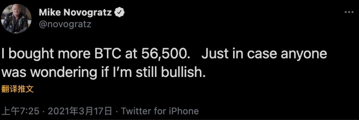 Galaxy Digital创始人Mike Novogratz以56500美元价格继续购入比特币