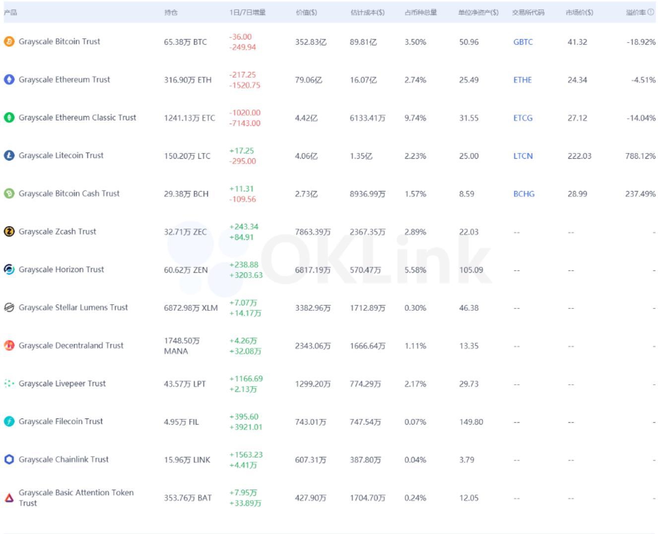 链捕手消息,据欧科云链OKLink数据显示,截至美东时间4月22日,灰度投资已发行的13支单一资产信托基金总价值为445.45亿美元,环比下降1.6%。 同时灰度增持17.25枚LTC、11.31枚BCH、243.34枚ZEC、238枚ZEN、7.07万XLM、4.26万MANA、1166枚LPT、395枚FIL、1563枚LINK以及7.95万枚BAT。 当前GBTC和ETHE溢价率分别为-18.92%和-4.51%,GBTC负溢价率跌至历史新低。