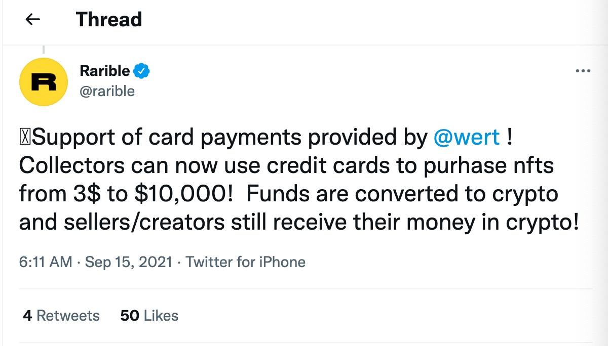 链捕手消息,NFT交易平台Rarible发推宣布,现已支持信用卡支付,这意味着买家可使用法币直接购买NFT。据Rarible,用户可使用信用卡购买3美元到10,000美元的NFT,所支付的资金将被转换为加密货币,卖家/创作者仍然以加密货币收到他们所卖出作品的款项。(来源链接)
