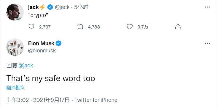 链捕手消息,推特创始人Jack Dorsey在个人推特上写下“crypto”关键词,得到了众多网友留言,特斯拉创始人马斯克回复称,“That’s my safe word too”。