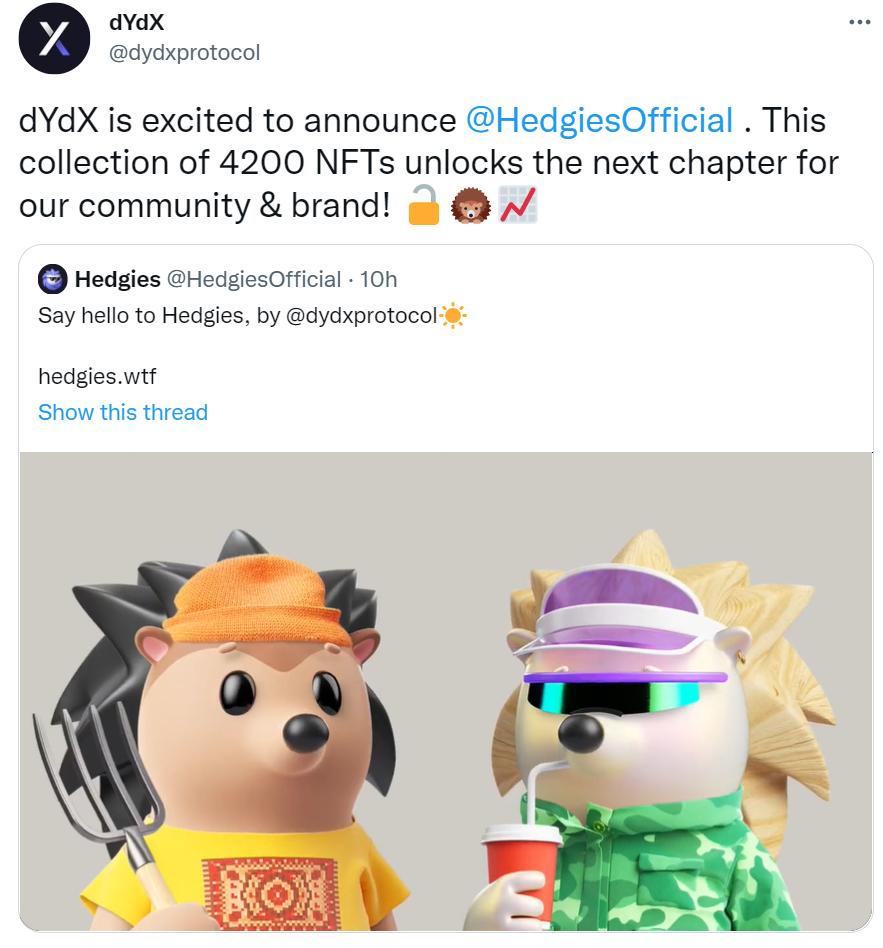 dYdX宣布推出Hedgies NFT系列,铸造将于2月开启