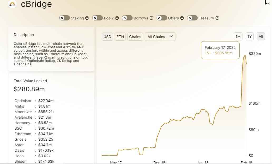 ZEC $345.76 +0.29%链捕手消息,据DeFi Llama数据,由 Celer Network 推出的跨链桥项目cBridge昨日锁仓量突破3亿美元,创历史新高,7日增长幅度超100%。