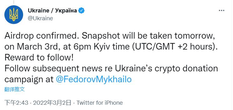链捕手消息,乌克兰官方在社交媒体上发文表示,将向为其捐款的用户地址发放空投,并将于3月4日0点(UTC+8)进行快照。