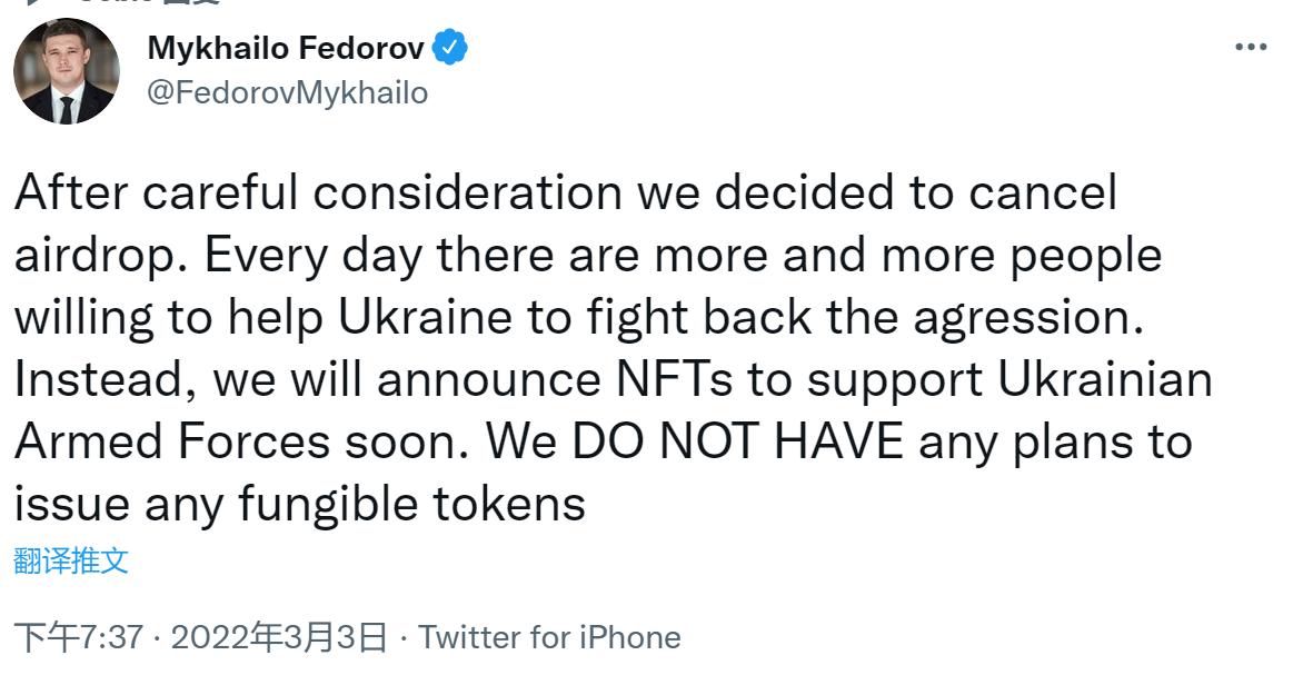 ZEC $355.96 -0.66%链捕手消息,乌克兰副总理Mykhailo Fedorov在推特表示经过慎重考虑,决定取消空投,目前没有任何发行可替代代币的计划,但很快宣布 NFT 以支持乌克兰。