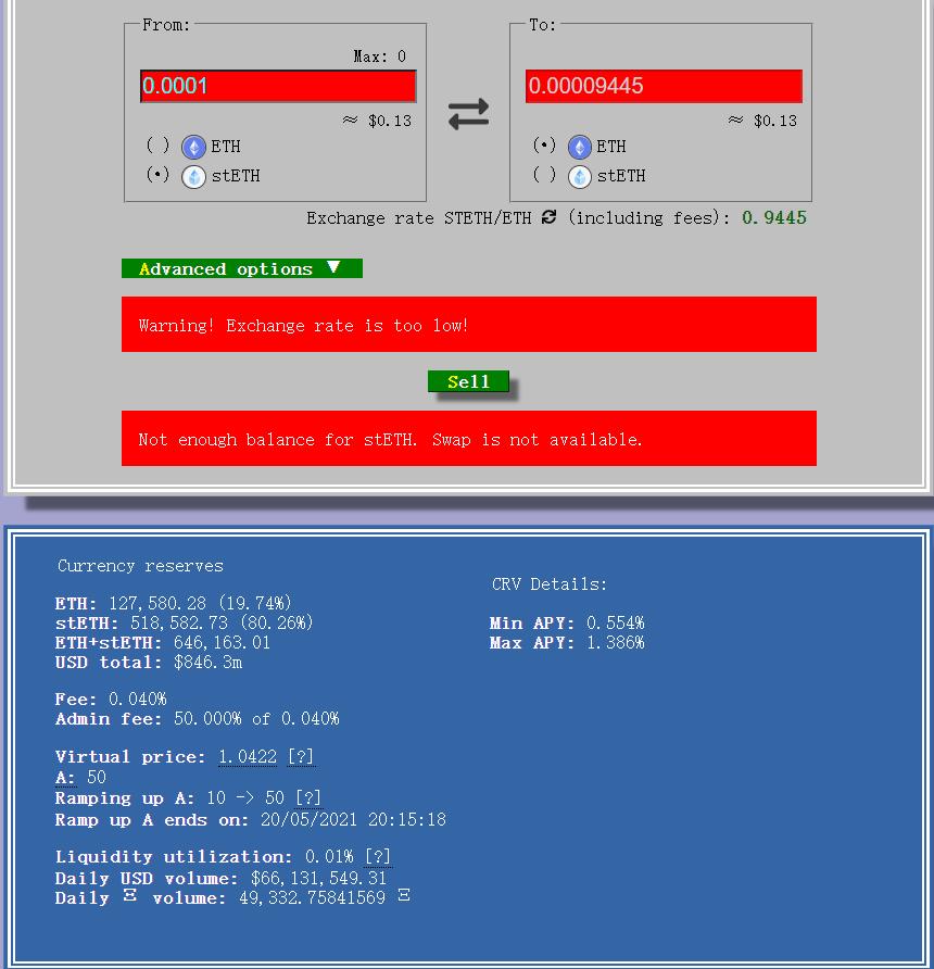 链捕手消息,Curve 上 ETH/stETH 流动性池的 stETH 兑换价格已跌至 0.9445 ETH,stETH 倾斜比例为 79.87%。