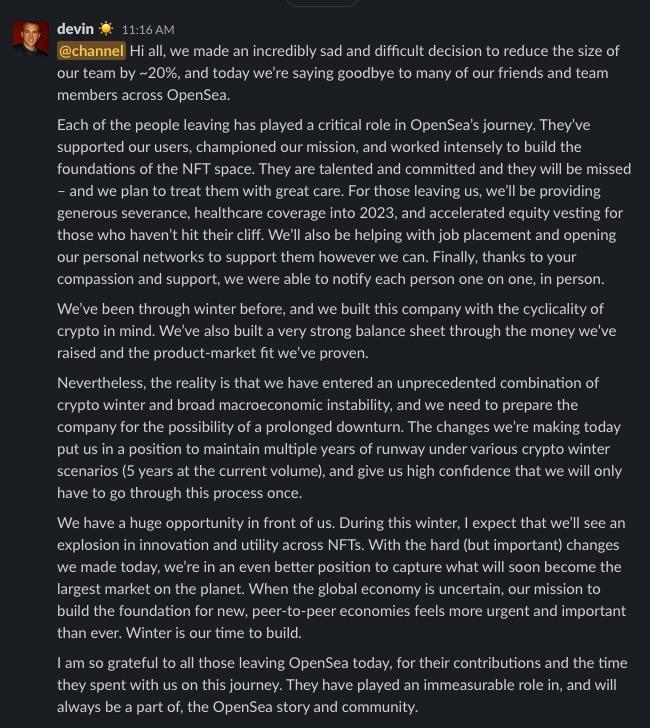Devin表示:“每个离开的人都在 OpenSea 的旅程中发挥了关键作用,现实情况是,我们已经进入了加密寒冬以及宏观经济不稳定的空前境地,公司要为长期低迷的可能性做好准备。”,而本轮裁员,Finzer 表示能让 OpenSea 在加密熊市中维持五年的正常运营。