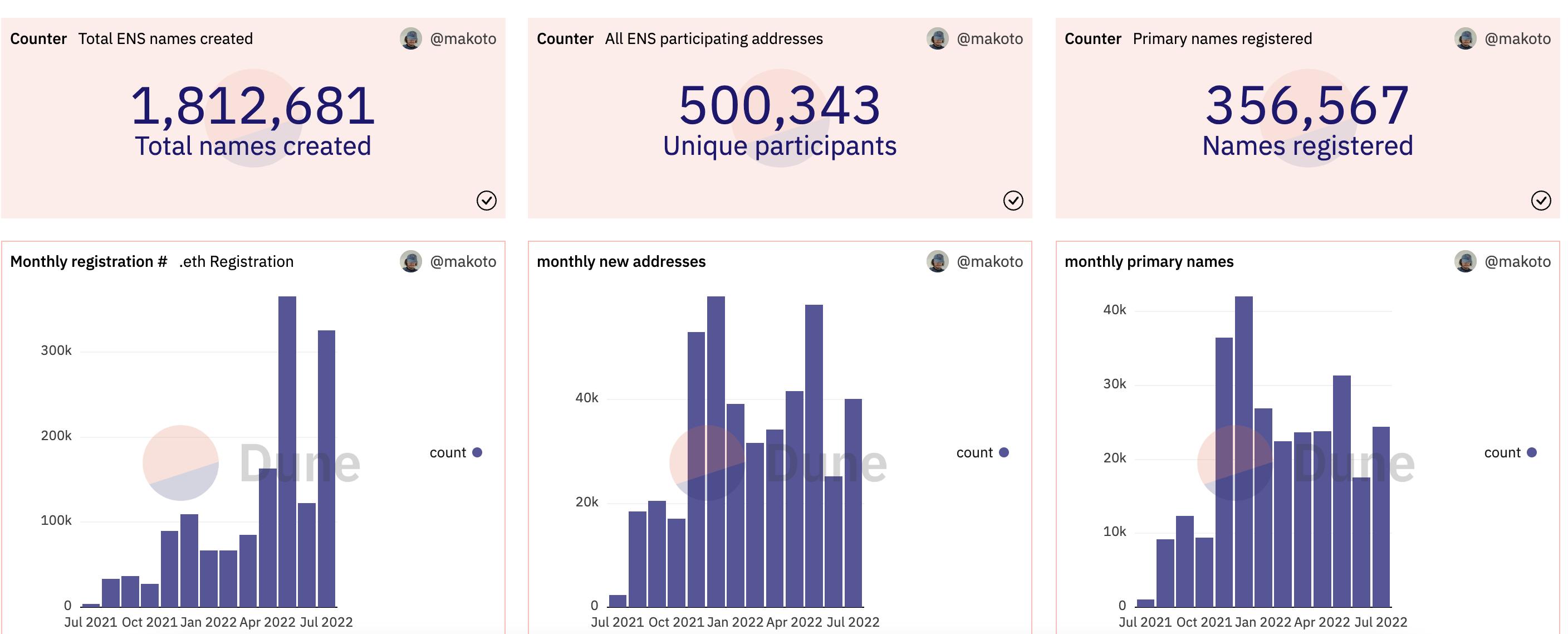 链捕手消息,据DuneAnalytics数据显示,以太坊域名服务独立地址数已突破50万,截至目前为500,343。此外,当前已注册的主域名数量为356,567个,已创建的域名总量为1,812,681个。