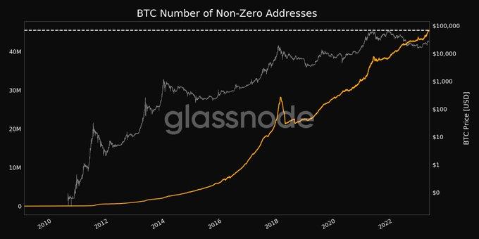 ChainCatcher 消息,Glassnode 数据显示,BTC 非零地址数达到 45,506,505 个,创历史新高。