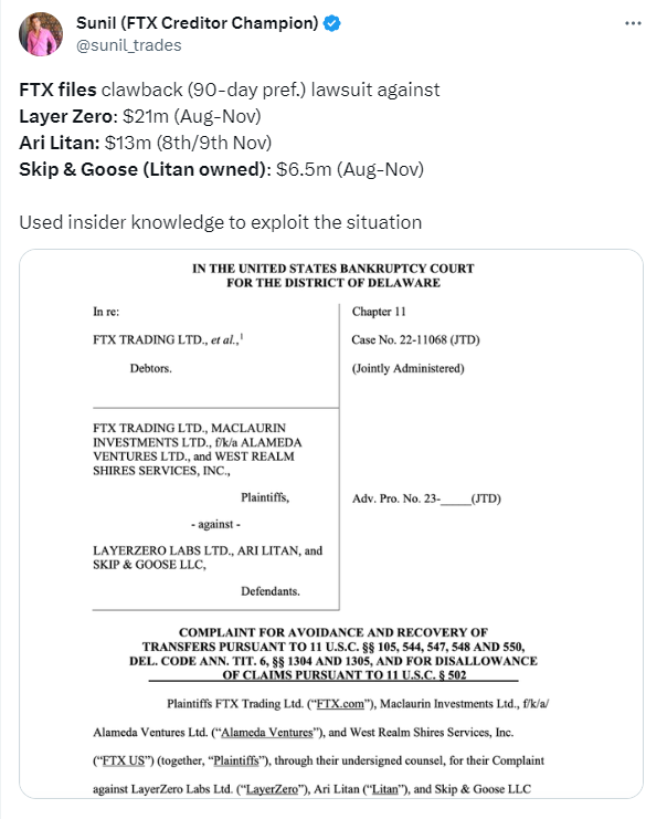 FTX 对 LayerZero 及其前 COO 等提起诉讼,以追回约 4100 万美元资产