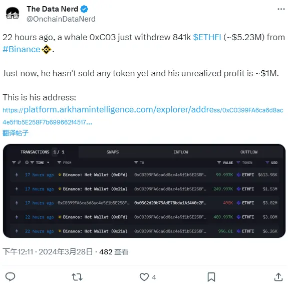ChainCatcher 消息,据 The Data Nerd 监测,22 小时前,0xC03 开头鲸鱼地址从币安提取 84.1 万枚 ETHFI(约合 523 万美元)。