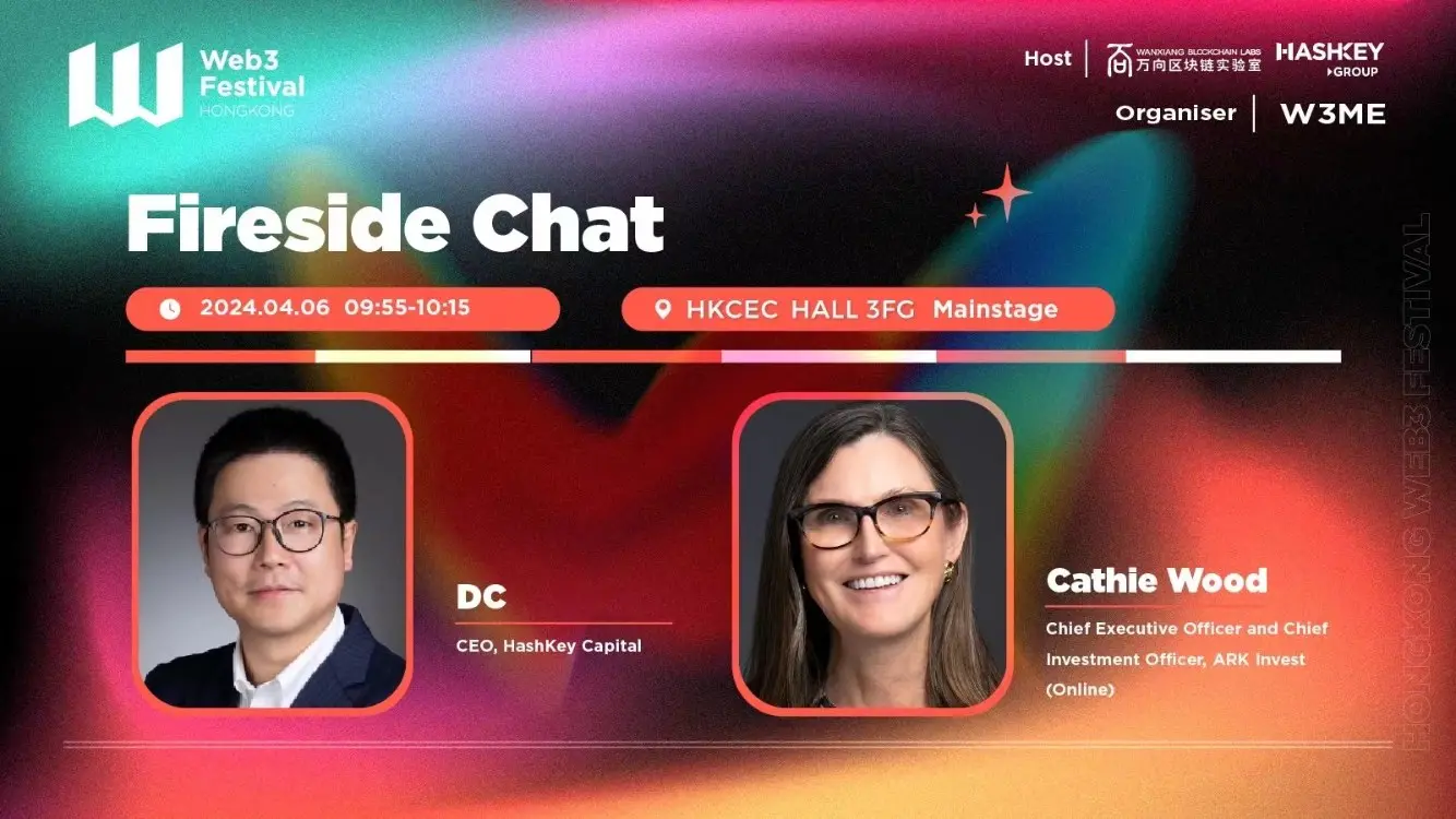 ChainCatcher 消息,4 月 6 日,香港 Web3 节开幕式将迎来一场引人瞩目的高能圆桌对话,届时,HashKey Capital CEO DC 和 ARK Invest 的 CEO 兼首席投资官 Cathie Wood 将如期亮相,融合华尔街和加密原生的双重视角,深入探讨加密货币、区块链和数字资产等行业的最新热门话题,为观众带来前沿见解和深度观点。