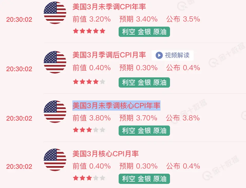 美国 3 月核心 CPI 月率 0.4%,预期 0.30%,前值 0.40%。