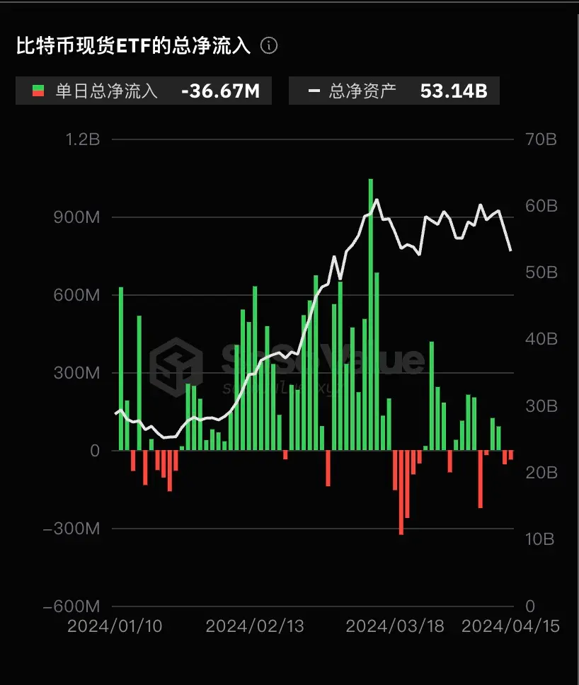 ChainCatcher 消息,根据 SoSoValue 数据,昨日(美东时间 4 月 15 日)比特币现货 ETF 总净流出 3667 万美元。