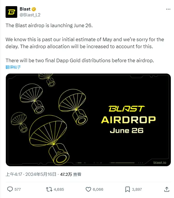 ZEC $341.17 -1.39%ChainCatcher 消息,以太坊 L2 网络 Blast 发文表示,其空投活动将于 6 月 26 日启动,这已经超过了最初预计的 5 月份,抱歉造成了延误,为此,将增加空投分配。在空投之前,将有两次最终的 Dapp Gold 分配。