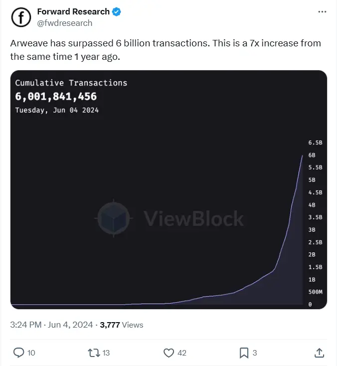 ChainCatcher 消息,据 Forward Research 数据,Arweave 的交易量已超过 60 亿笔。这比一年前同期增长了 7 倍。