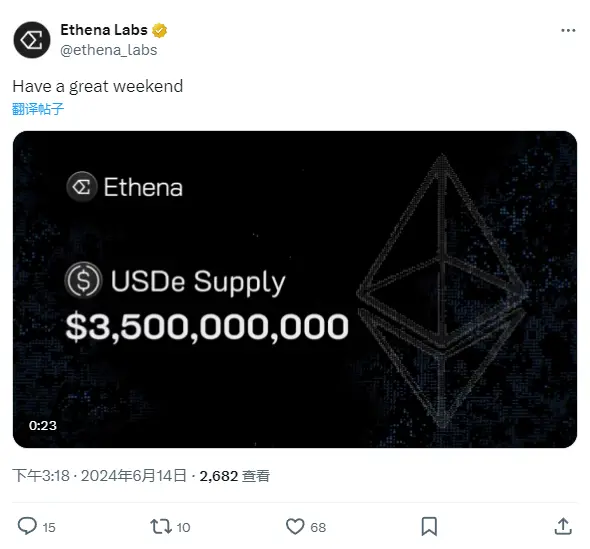Ethena 于 X 平台发文表示,USDe 供应量已达 35 亿枚。链上数据显示,持有地址数上升至 13457 个。