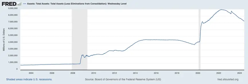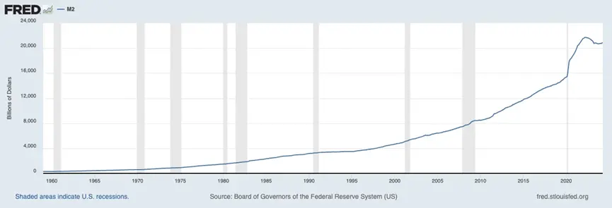 虽然自紧缩政策开始以来,美联储已经成功地将其资产负债表缩减了约 1.7 万亿美元,但 M2 货币供应量仍接近历史最高水平。