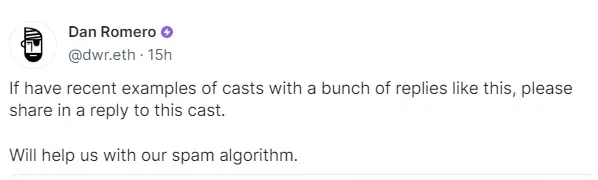 ChainCatcher 消息,Farcaster 联合创始人 Dan Romero 在 Warpcast 上发文表示,将整顿近期出现的机器人发帖问题。如果用户发现有大量类似回复的例子,请在该帖子下留言分享,以帮助平台改进垃圾邮件算法。