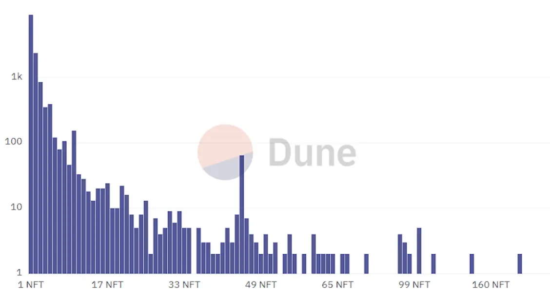 然而,事实证明,这一次质疑者似乎想错了。尽管有诸多质疑,许多“不明真相”的投资者乃至传统市场的大佬纷纷入场。根据Dune相关数据,共有177人至少持有45枚NFT。从价格表现来看,上线3天地板价就翻了700%+,部分稀缺NFT甚至被炒到了10,000 ETH(约4千万美元),让这批购买者赚得盆满钵满,成为第一波吃螃蟹的人。由此可见,名人效应加持NFT玩法的强大吸引力和巨大潜力,难免让众多投资者趋之若鹜。