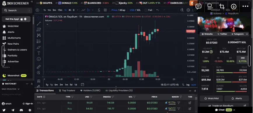 特朗普概念的Meme币同样在加密市场中表现亮眼。随着大选竞争的日益激烈,特朗普相关的Meme币一度接近疯狂。枪击事件的发生为Doland Tremp($TREMP)和MAGA($TRUMP)分别带来了87%和53%的瞬时涨幅。21日,随着拜登宣布辞去民主党总统候选人职务,一个名为Dark MAGA($DMAGA)的暗黑系特朗普Meme币暴涨了近百倍,市值一度接近8300万美元。