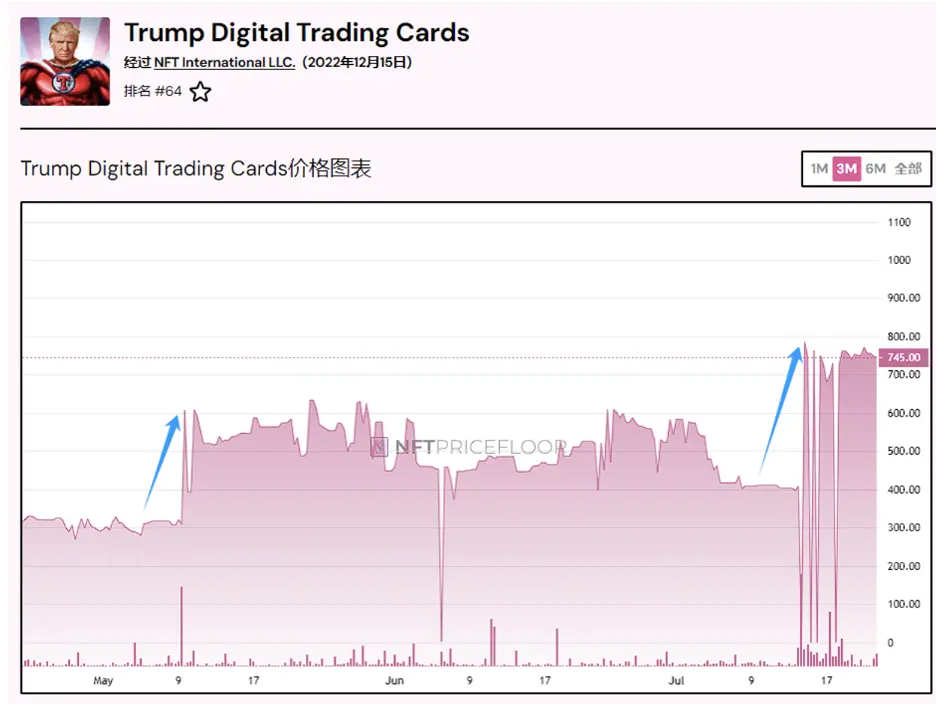 值得注意的是,在特朗普举办NFT晚宴期间,该系列NFT已经经历过一次120%的涨幅。短短两个月内再度暴涨,尤其是在当前NFT市场整体低迷、主要项目地板价下降了50%以上的情况下,这样的价格表现显得尤为瞩目。人们不禁猜测,特朗普概念是否真的是下一个财富密码?