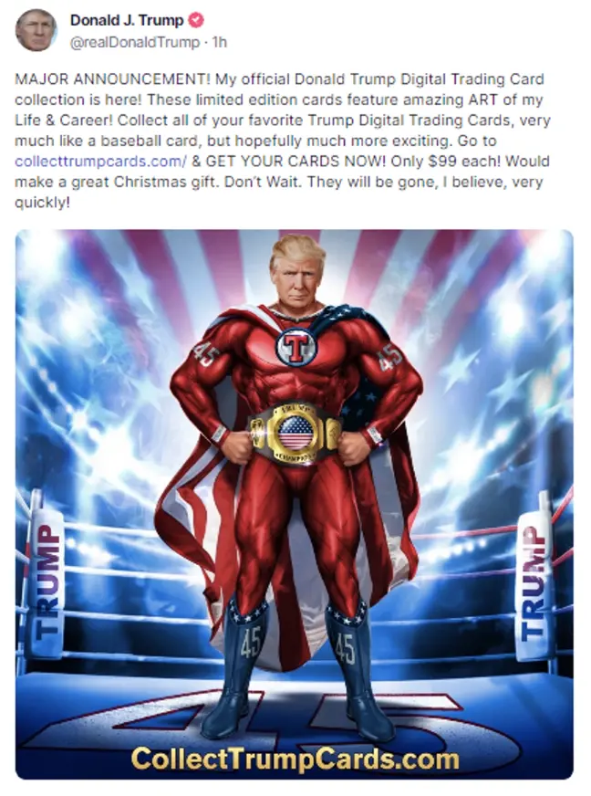 2022年12月16日,特朗普发布了他的第一系列NFT——特朗普数字交易卡(Trump Digital Trading Cards)。该系列由NFT International LLC. 创建,共包含45,000个在Polygon区块链上的NFT,展示了特朗普以超级英雄、赛车手、宇航员、西部警长等形象。