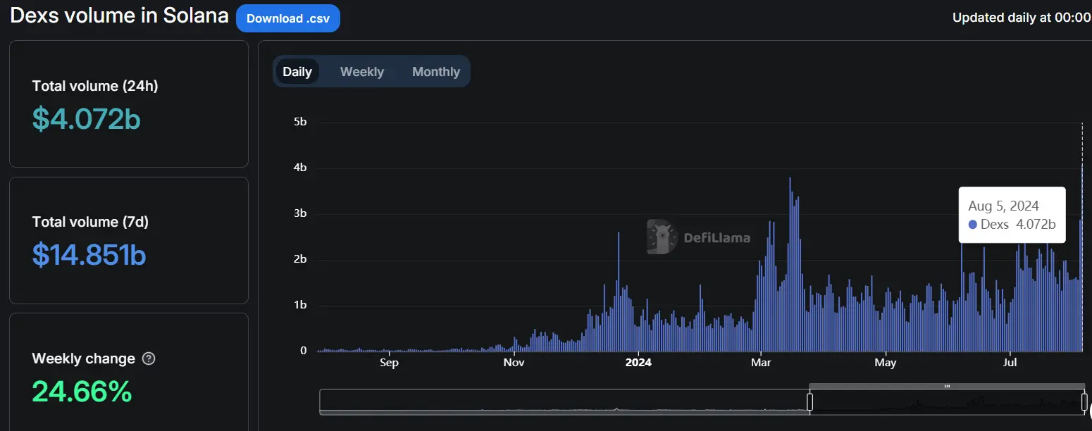 ChainCatcher 消息,据 DeFiLlama 数据显示,过去 24小时 Solana 链上 DEX 交易量超 40 亿美元,创下历史新高。