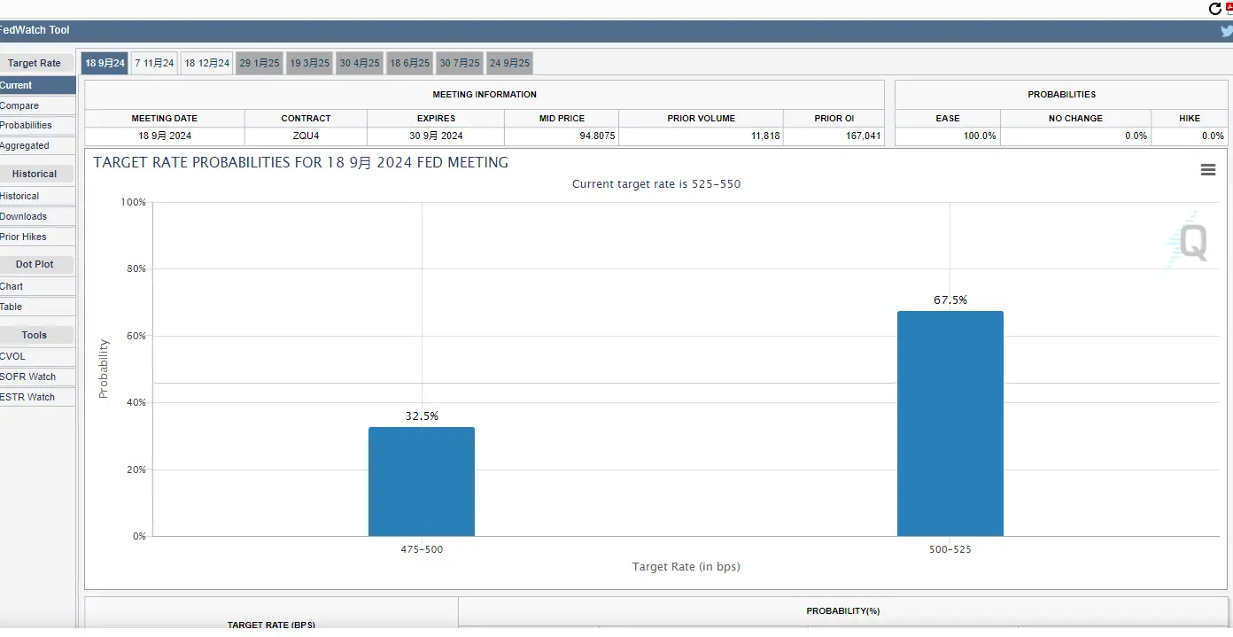 据 CME(美联储观察)数据,截止发稿,美联储 9 月降息 25 个基点的概率为 67.5%,降息 50 个基点的概率为 32.5%。