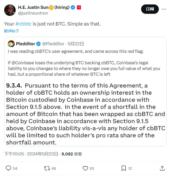 ZEC $260.31 -8.86%ChainCatcher 消息,孙宇晨在 X 发文表示“你的 cbbtc 不是 BTC,就是这么简单”。
