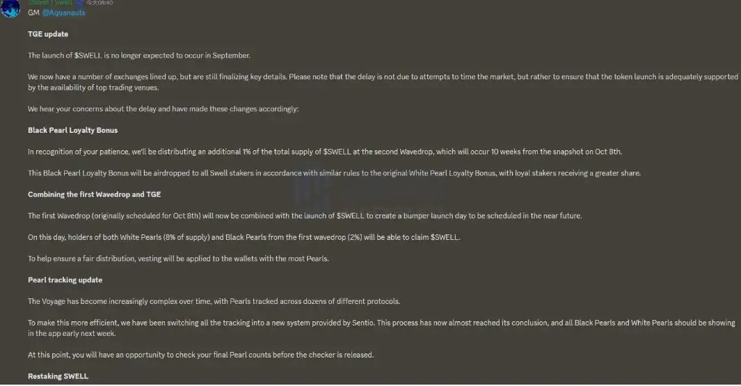 ChainCatcher 消息,流动性再质押平台 Swell 在其 Discord 社区发布公告称,为确保获得头部交易平台支持,项目预计不会在 9 月 TGE。相应的社区活动忠诚奖励也将做出调整。