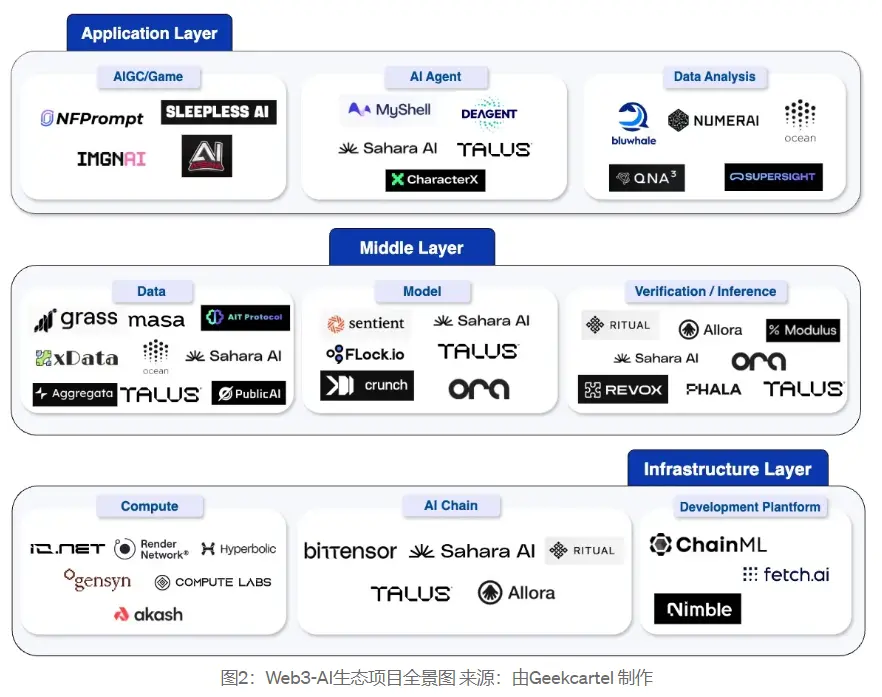 我们主要研究了 Web3-AI 赛道的 41 个项目,并将这些项目划分为不同的层级。每一层的划分逻辑如下图所示,包括基础设施层、中间层和应用层,每一层又分为不同的板块。在下一章节中,我们将对一些具有代表性的项目进行深度解析。