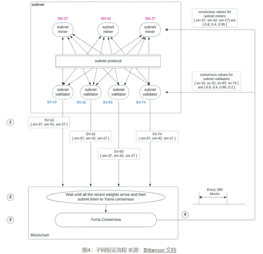 子网验证器可以随时将其排名权重向量传输到区块链上。但是子网的 Yuma 共识周期在每 360 个区块(即 4320 秒或 72 分钟,以每区块 12 秒计)开始时使用最新的权重矩阵。如果子网验证器的排名权重向量在 360 区块周期后到达,那么该权重向量将在下一个 Yuma 共识周期开始时使用。每个周期结束完成 TAO 奖励的发放。