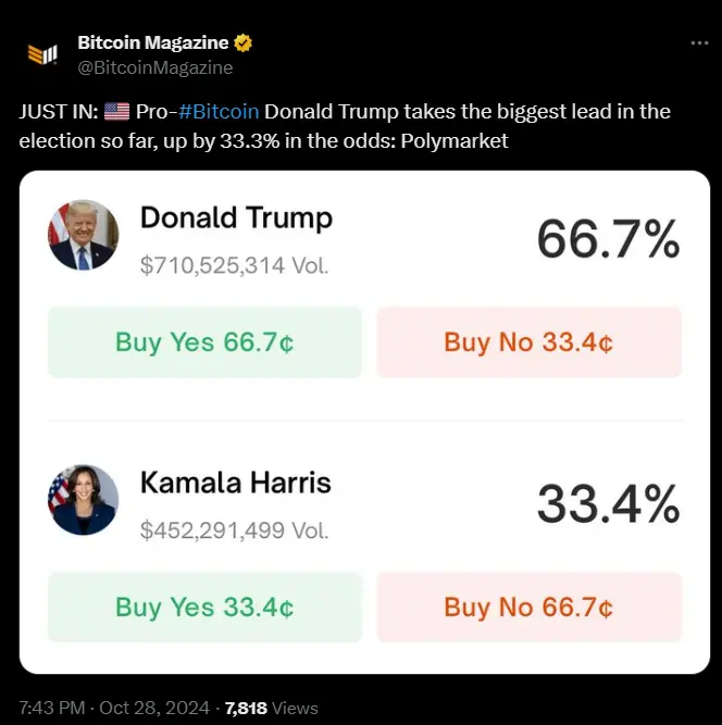 数据:Polymarket 上特朗普与哈里斯的胜选概率差扩大至 33.3%