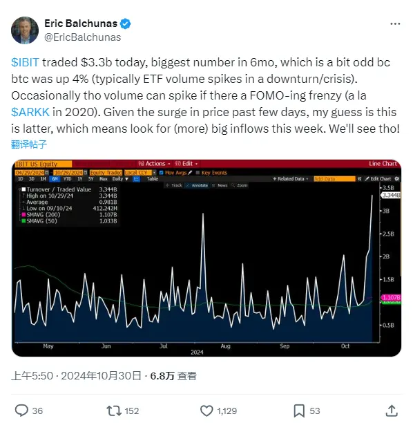 尽管通常 ETF 交易量会在经济低迷/危机时激增,但 Balchunas 更倾向于这是市场 FOMO 情绪导致,这意味着本周将出现更多大额流入。
