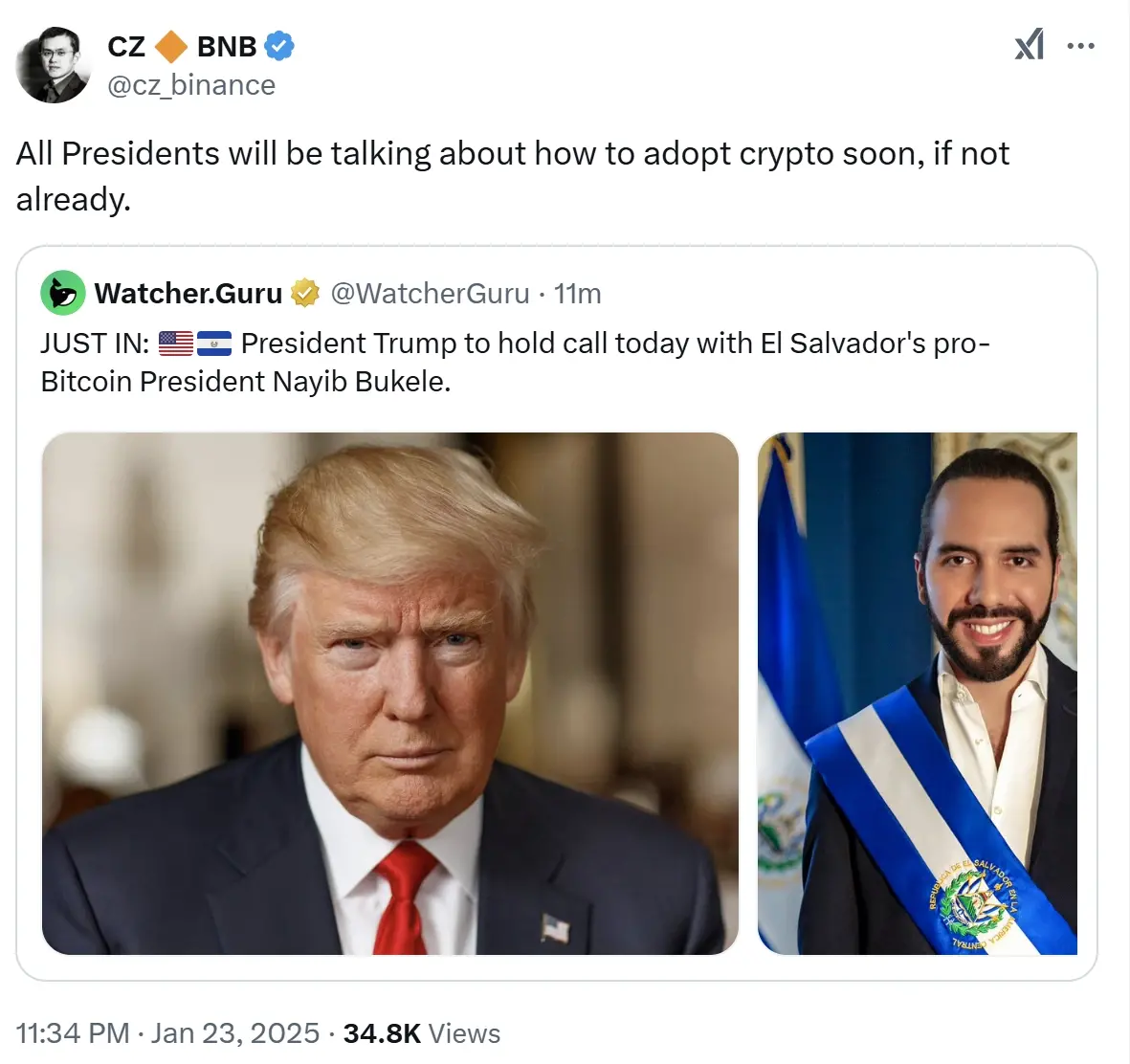 ChainCatcher 消息,赵长鹏针对“特朗普将与萨尔瓦多总统通话”表示,所有总统都将讨论如何尽快采用加密货币(如果还没有的话)。