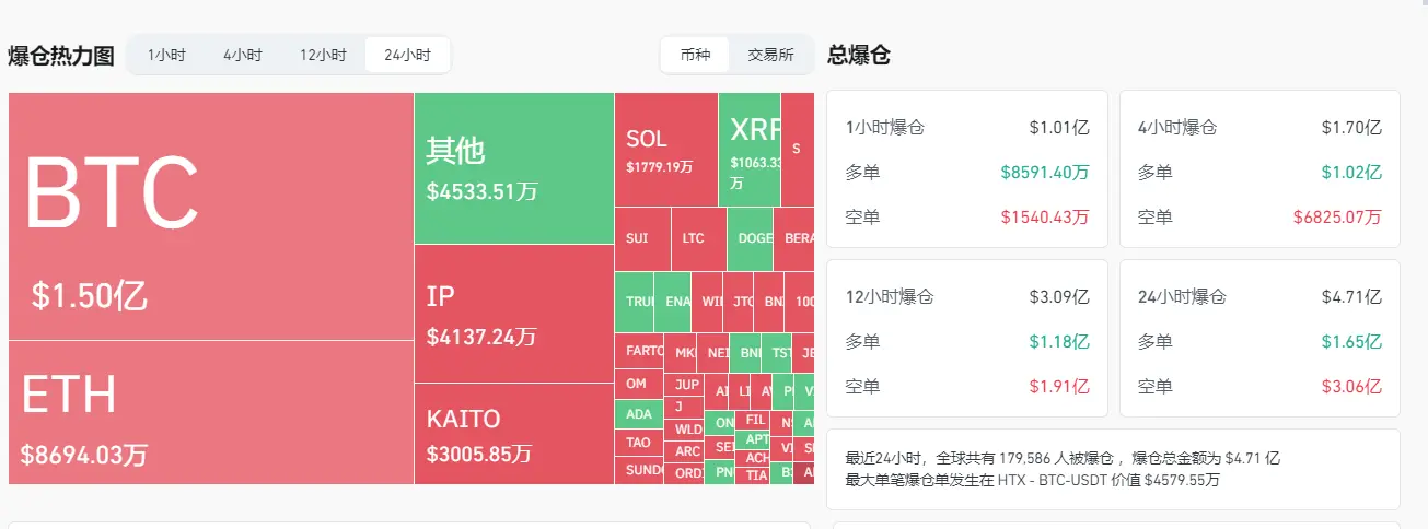 ChainCatcher 消息,据 coinglass 数据显示,过去 24 小时全网爆仓金额为 4.71 亿美元,多单爆仓金额为 1.65 亿美元,空单爆仓金额为 3.06 亿美元,其中 BTC 爆仓金额为 1.50 亿美元,ETH 爆仓金额为 8694 万美元,IP 爆仓金额为 4137 万美元。