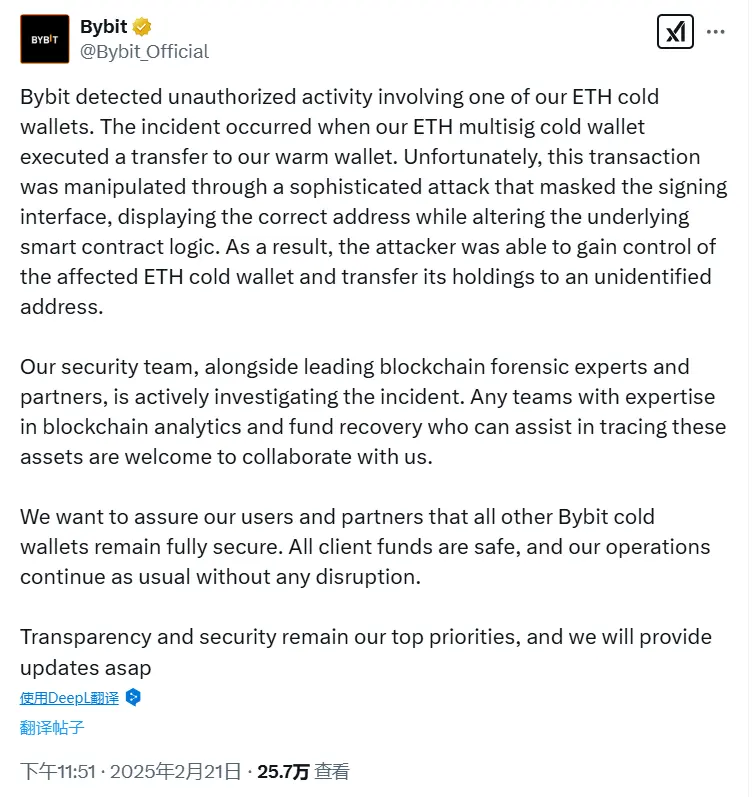 平台强调,其他冷钱包均安全无虞,所有客户资金安全,平台运营未受影响。Bybit 承诺将保持透明,并尽快提供后续进展。