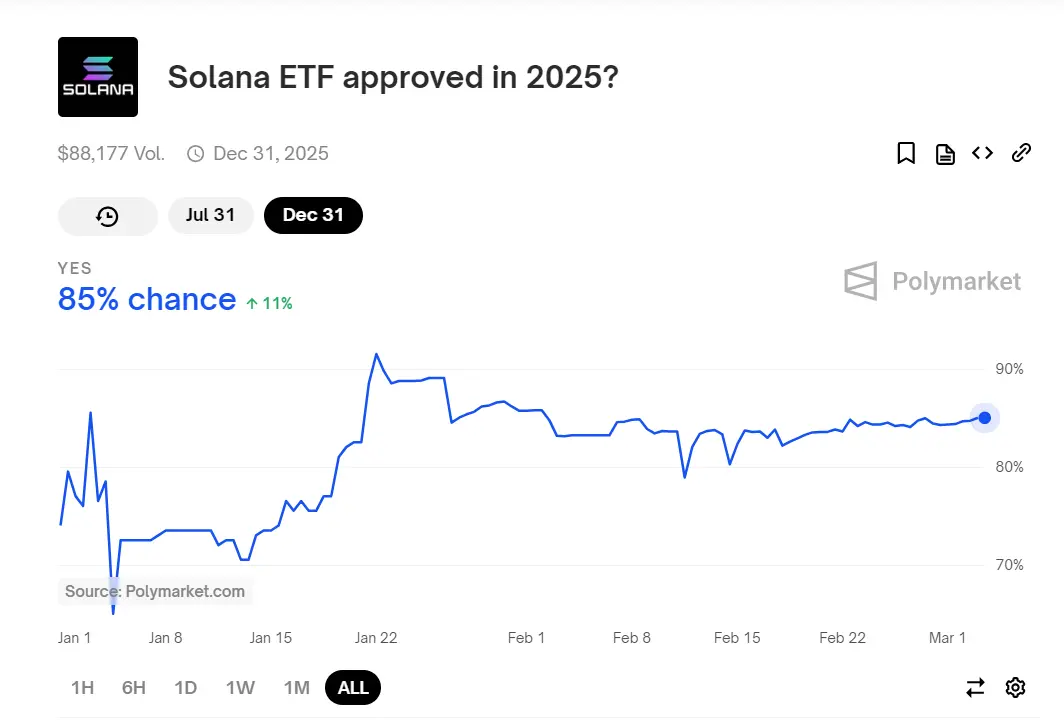 ChainCatcher 消息,据预测市场 Polymarket 数据显示,预测 Solana ETF 在 2025 年获批的概率现报 85%,目前该预测合约总交易量为 88,177 美元。