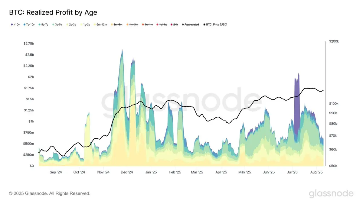 ChainCatcher 消息,据 glassnode 监测,BTC 长期持有者的获利实现速度在 7 月持续超 10 亿美元 / 天,8 月有所放缓。与 2024 年 11 月、12 月的峰值由 6-12 个月持有者(早期比特币现货 ETF 购买者)主导不同,最新一波浪潮由 3-5 年持有者主导,即上一周期的投资者实现了收益。