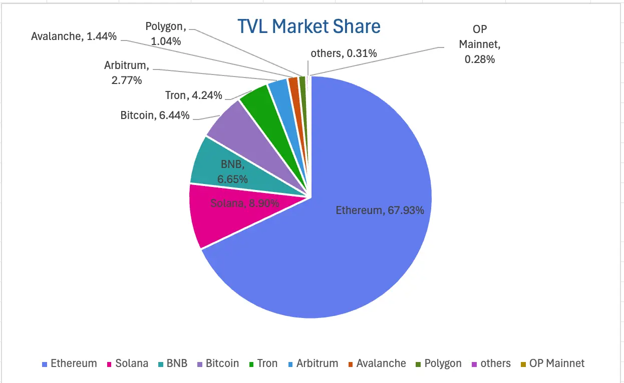 按公链进行划分,其中TVL最高的三条公链分别是Ethereum链,占比67.57%;Solana链,占比8.79%;BNB Chain,占比6.95%。