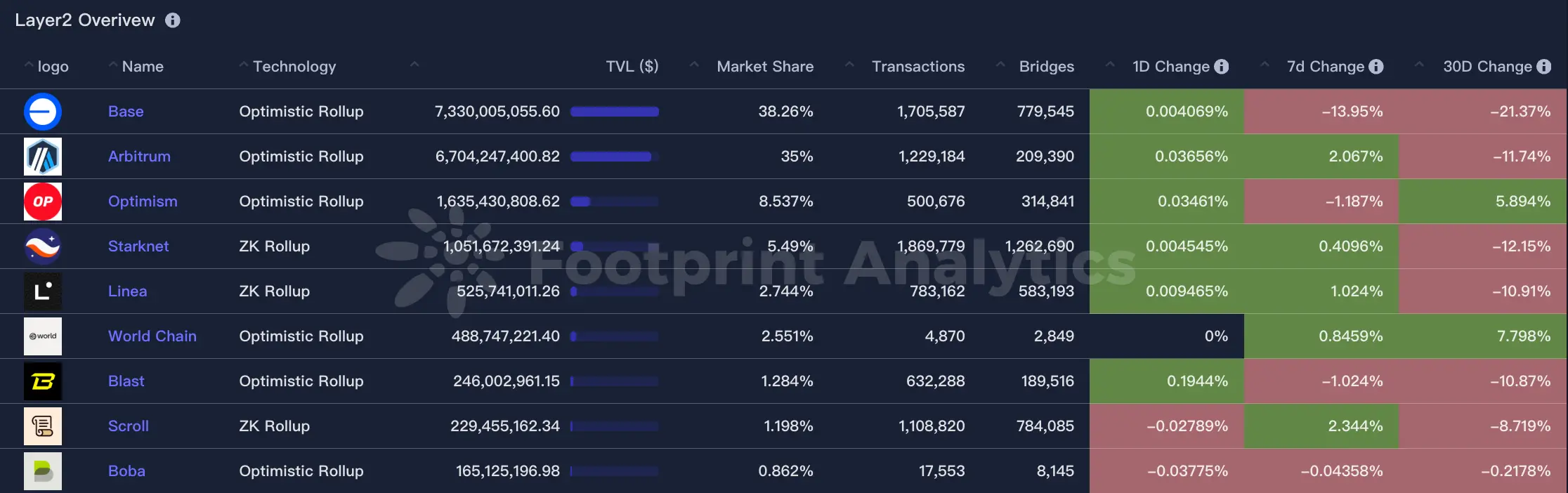 Base 和 Arbitrum 分别以 36.85% 和 34.77% 的市场份额占据前排,Base链过去一周市场份额下降13.82%,Arbitrum轻微上升1.95%。