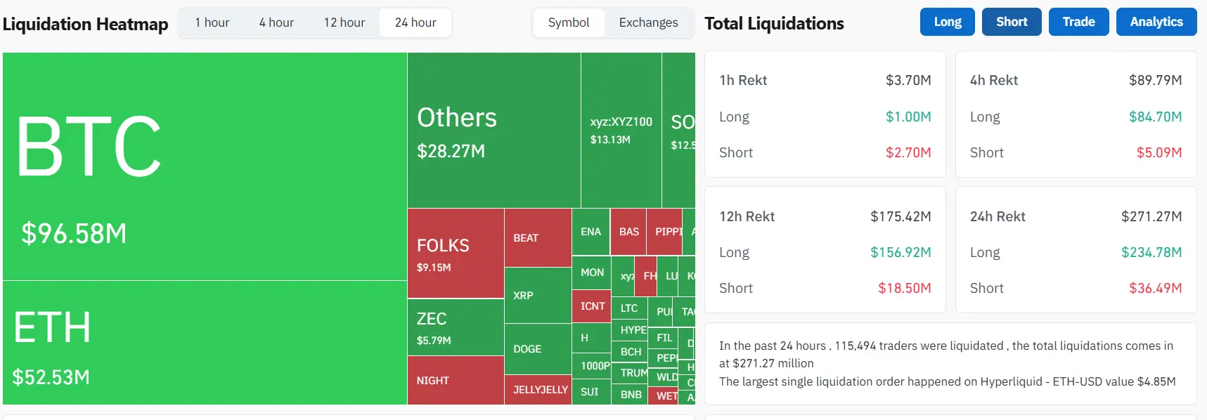 ChainCatcher 消息,据 Coinglass 数据,过去 24 小时,全球共有 115,450 人被爆仓,爆仓总金额为 2.71 亿美元。
