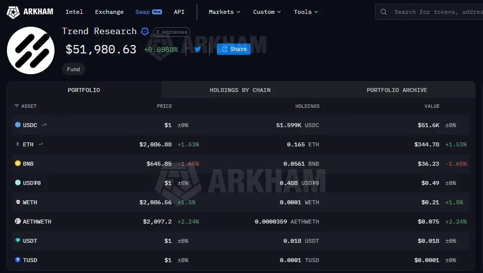 ChainCatcher 消息,据 Arkham 监测,今晨 10:49,易理华旗下 Trend Research 将最后约 534 枚 ETH 转入币安,价值约 111 万美元,完成彻底清仓,链上地址目前仅剩 0.165 枚 ETH。