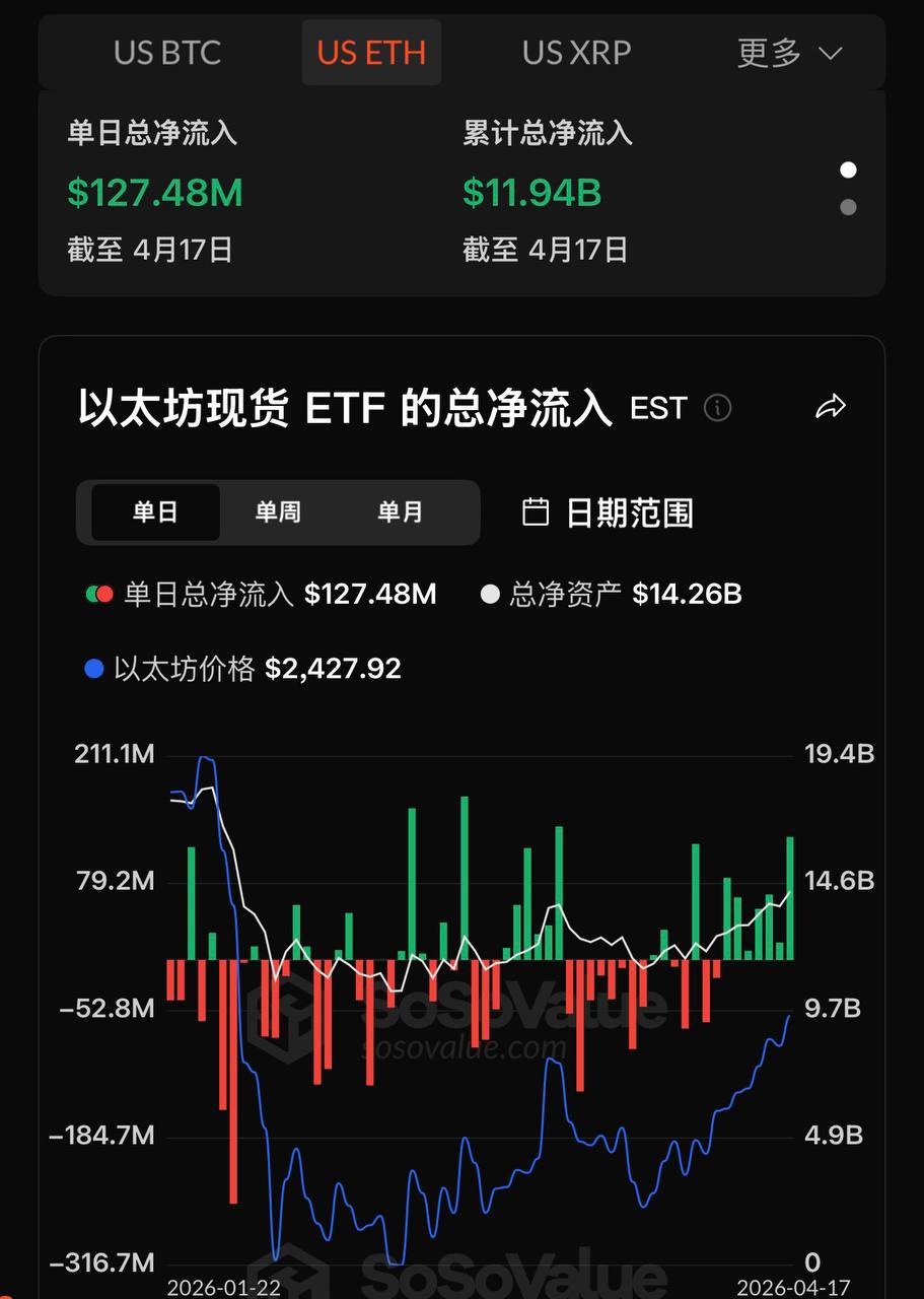 ChainCatcher 消息,根据 SoSoValue 数据,昨日(美东时间 4 月 17 日)以太坊现货 ETF 总净流入 1.27 亿美元。