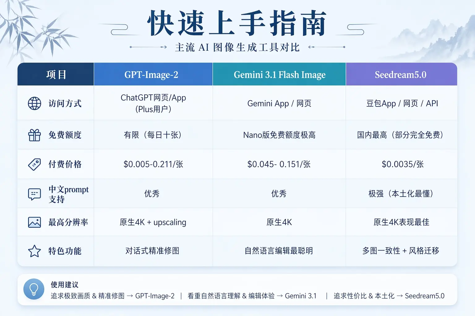 基于全部测试过程的综合感受,Gemini 3.1 Flash Image 在速度和移动端体验上领先;Seedream 5.0 Lite 在国内访问与中文长 prompt 处理上最流畅;GPT-Image-2 则以 thinking 模式下的对话式精准修图取胜。