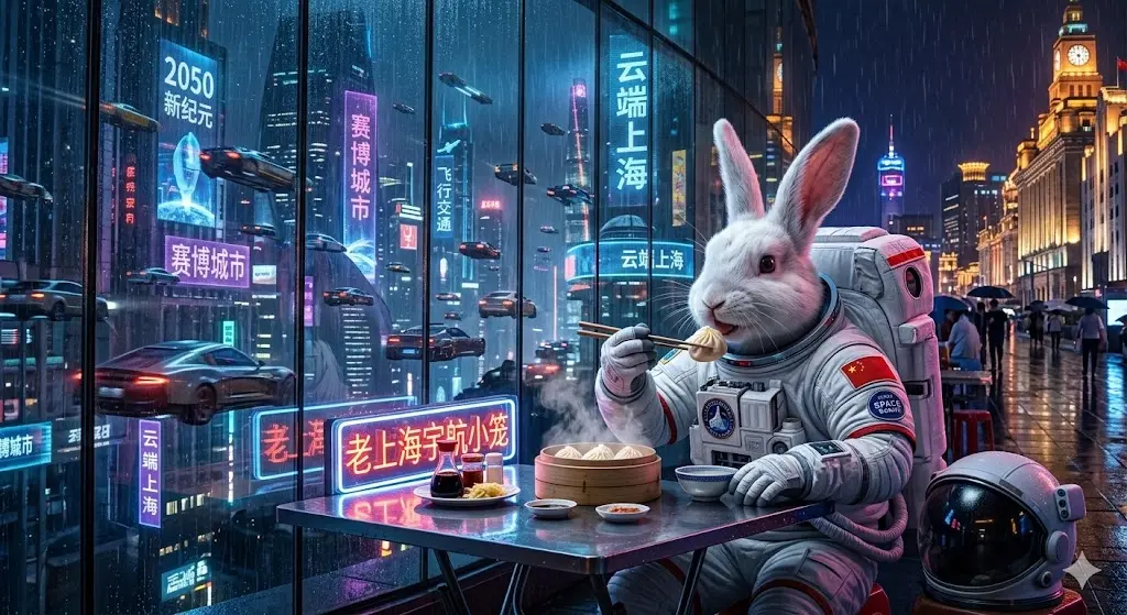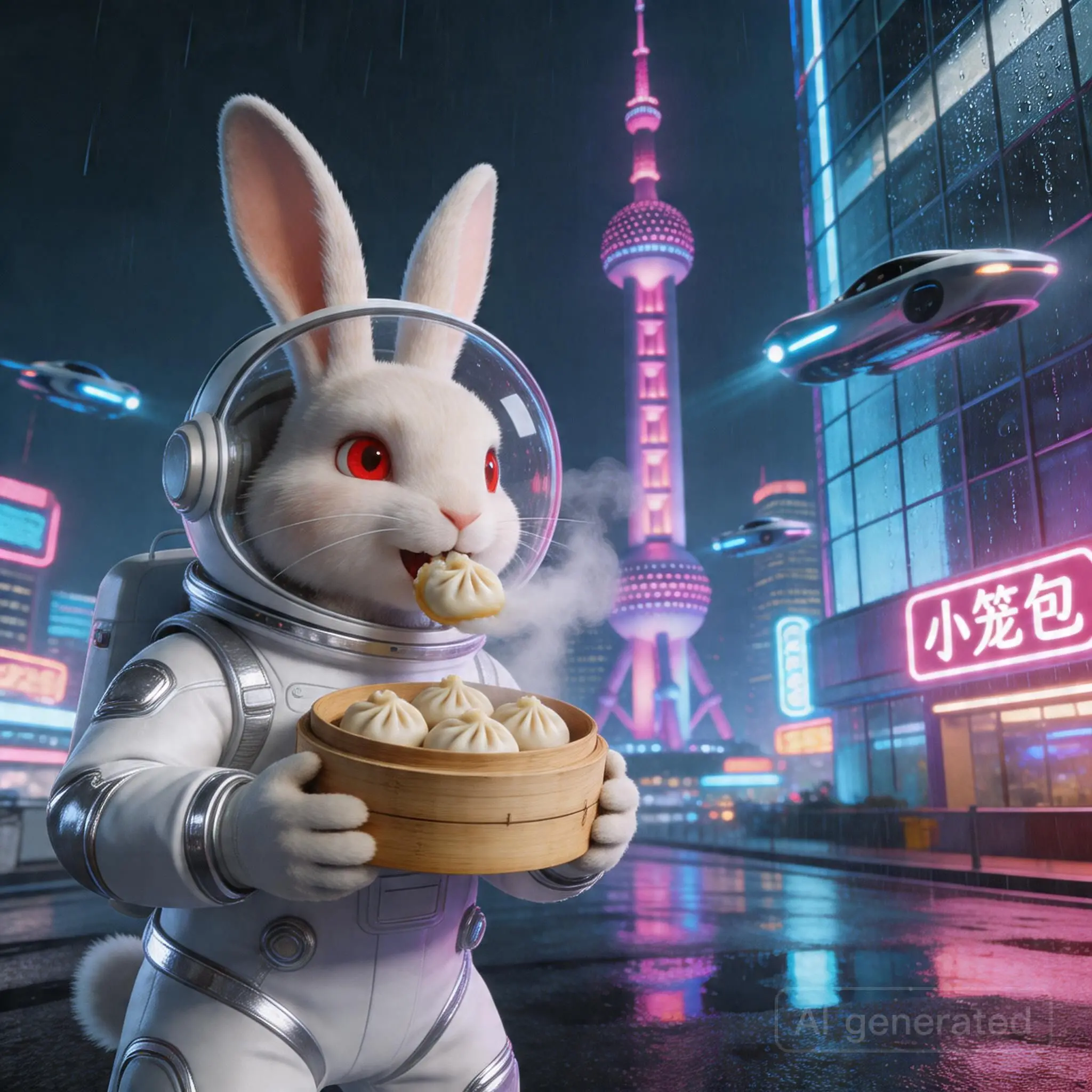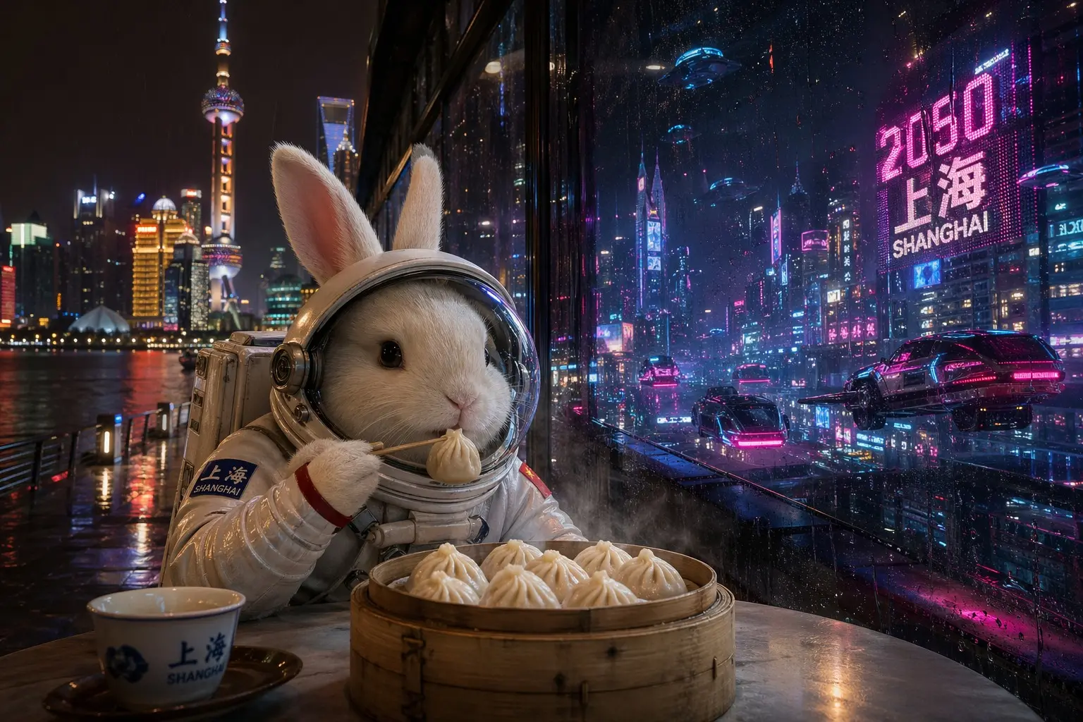 测试prompt: “一个穿着白色宇航服的兔子在霓虹灯闪烁的上海外滩吃热气腾腾的小笼包,身后是雨夜反光的玻璃幕墙,倒映出2050年飞车穿梭的赛博朋克景象,电影级光影,超现实细节,8K画质。”